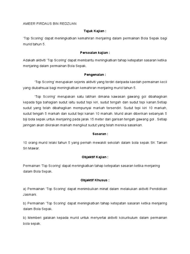Objektif kajian bola sepak. Kertas kerja bola sepak 1. Keadaan ini juga dapat kita lihat turut menular dikalangan pelajar sekolah sekolah rendah. Sebilangan besar pemain juga bermain bola sepak pada peringkat amatur. 10 pemain pula digelar outfield players yang perlu digunakan sebaik baiknya oleh jurulatih dalam perancangan taktikal pasukan.