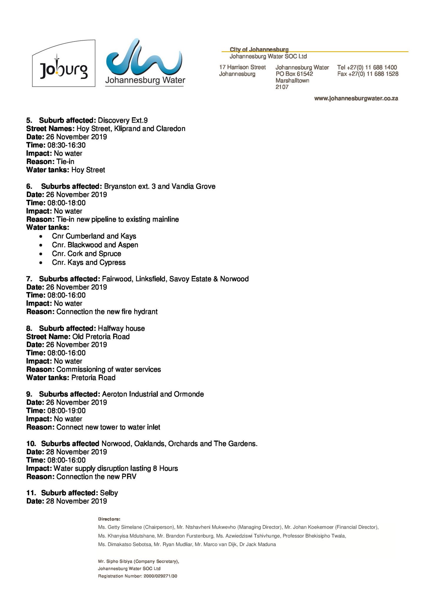 Johannesburg Water On Twitter Please Note Daily Updates Below