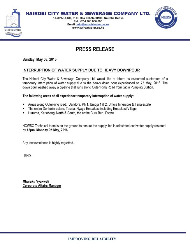 Nairobi Water On Twitter Kamemefm Notice Interruption Of